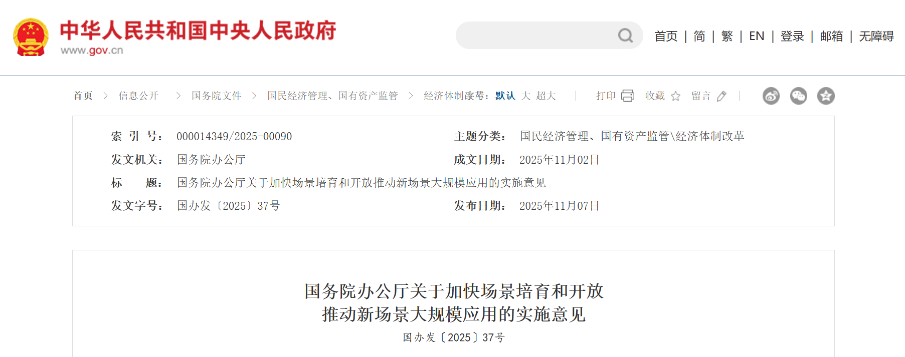 • 11-082025 《關于加快場景培育和開放推動新場景大規模應用的實施意見》發布